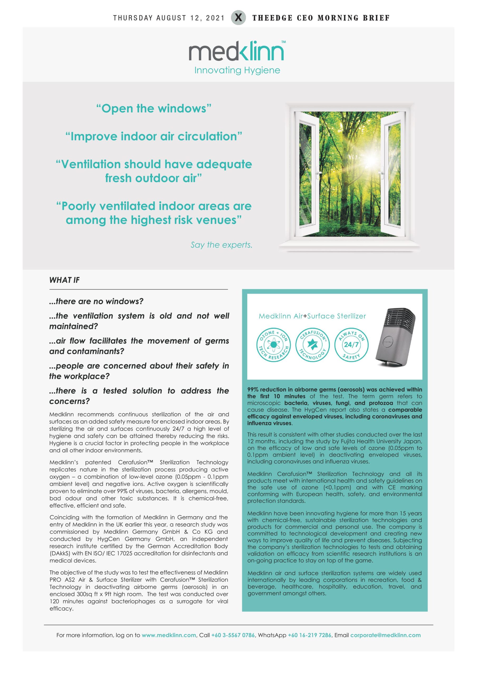 Medklinn have been innovating hygiene for more than 15 years with chemical-free, sustainable sterilization technologies and products for commercial and personal use. The company is committed to technological development and creating new ways to improve quality of life and prevent diseases. Subjecting the company’s sterilization technologies to tests and obtaining validation on efficacy from scientific research institutions is an on-going practice to stay on top of the game.