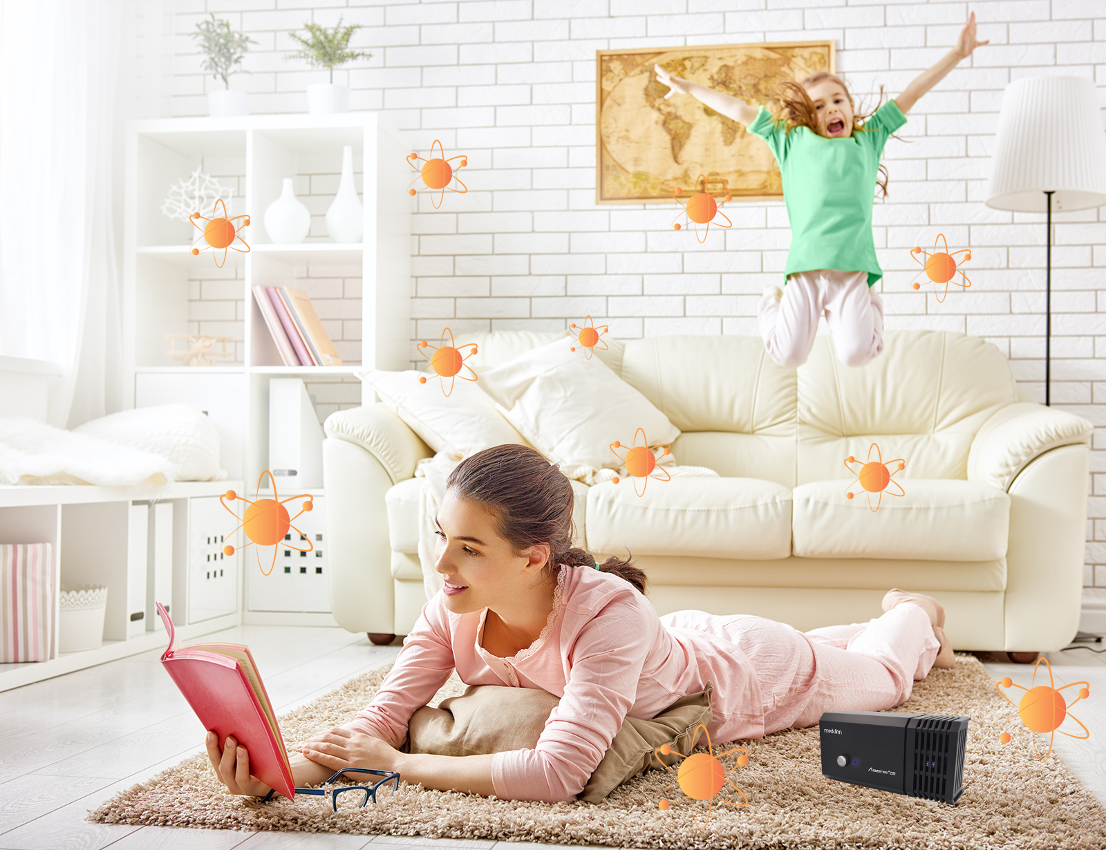 How? Using Active Oxygen, which can kill 99.9% of all viruses, bacteria, germs and even bad smell, comes in the form of gas and can be produced by a small and energy efficient device at home. The Medklinn Air+Surface sterilizer is the perfect device to be used in the disinfectant room because the active oxygen which consists of O- and O3 gas, is non-harmful to humans (in fact healthy!) and eliminates all pathogens within a confined space by reaching every surfaces and sterilizing the air within the room.