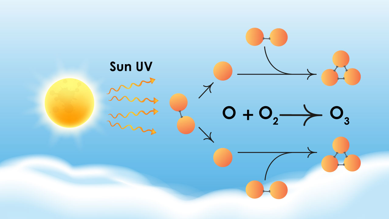 Ozone (O3) is created when the sun’s rays break up an oxygen molecule (O2) into single independent atoms and then they in turn re-attach to another oxygen molecule to form ozone (O3). Known to be in the higher atmosphere to protect life on earth from harmful UV rays.